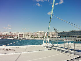 Navegación en catamarán hacia la puesta del sol y copa de cava con Mundo Marino