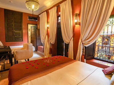 Venez vivre un séjour romantique digne des Mille et Une Nuits au Riad Hermès, en plein cœur de Marrakech. Lors de 3 jours et 2 nuits pour 2 personnes dans une superbe suite Junior, vous profiterez pleinement de ce que cet établissement a à vous offrir : vue panoramique sur les sommets enneigés de l'Atlas, la célèbre Mosquée de la Koutoubia ou le palais Dar El Bacha, une piscine et une terrasse depuis lesquelles vous pourrez prendre un bain de soleil… à vous les vacances ! Après avoir démarré la journée par un bon petit-déjeuner, vous partirez en excursion pour un inoubliable baptême en dromadaire à la découverte des splendides paysages du Circuit de la Palmeraie. Au retour, vous pourrez prendre la direction du hammam pour une séance de 30 min avec un gommage au savon noir dont vous ressortirez détendus. N’hésitez plus, une parenthèse idyllique en duo vous attend !