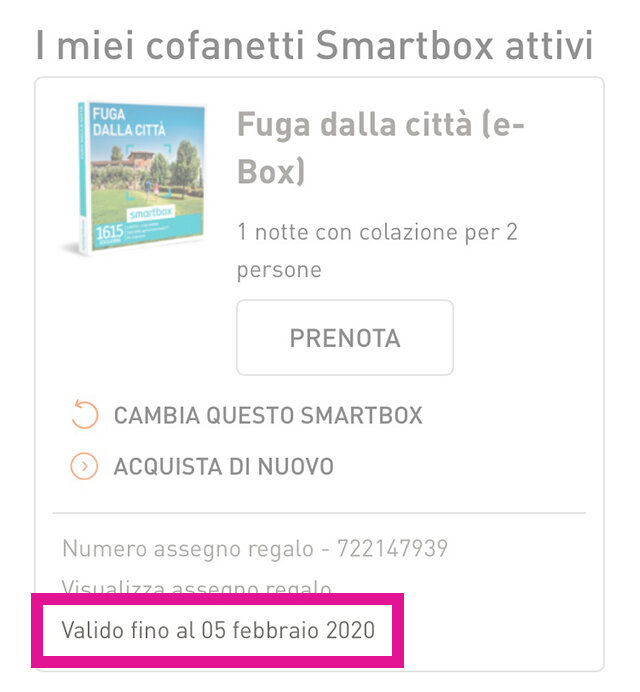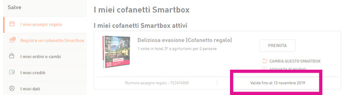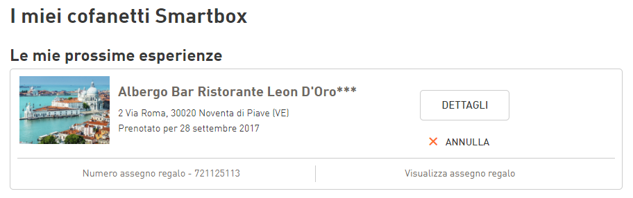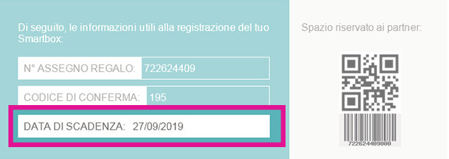 - Un assegno regalo Smartbox, all’interno del quale troverai il N. di assegno regalo e il codice di conferma da utilizzare per prenotare la tua esperienza