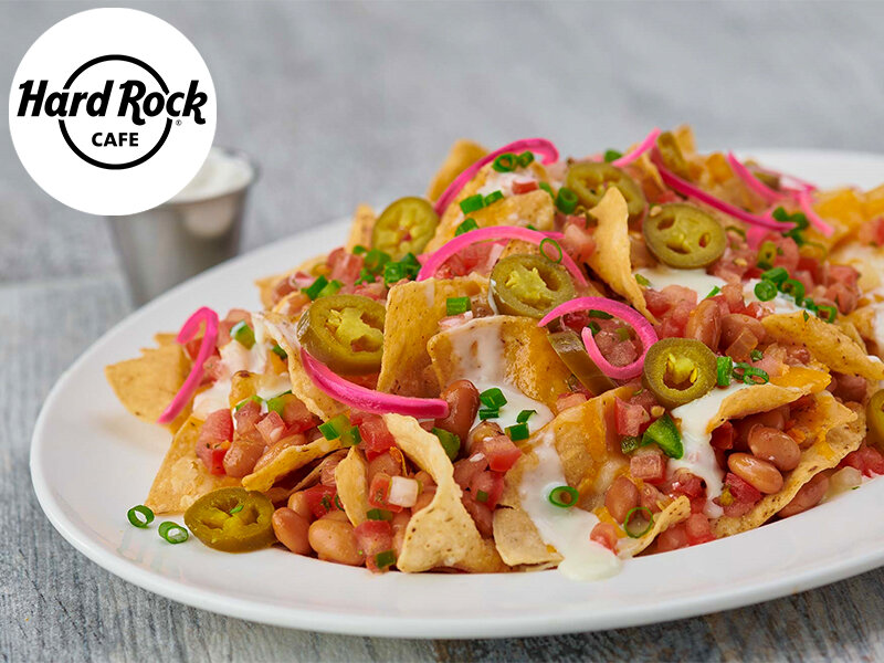 Note di gusto con nachos e soft drink in un Hard Rock Cafe a scelta